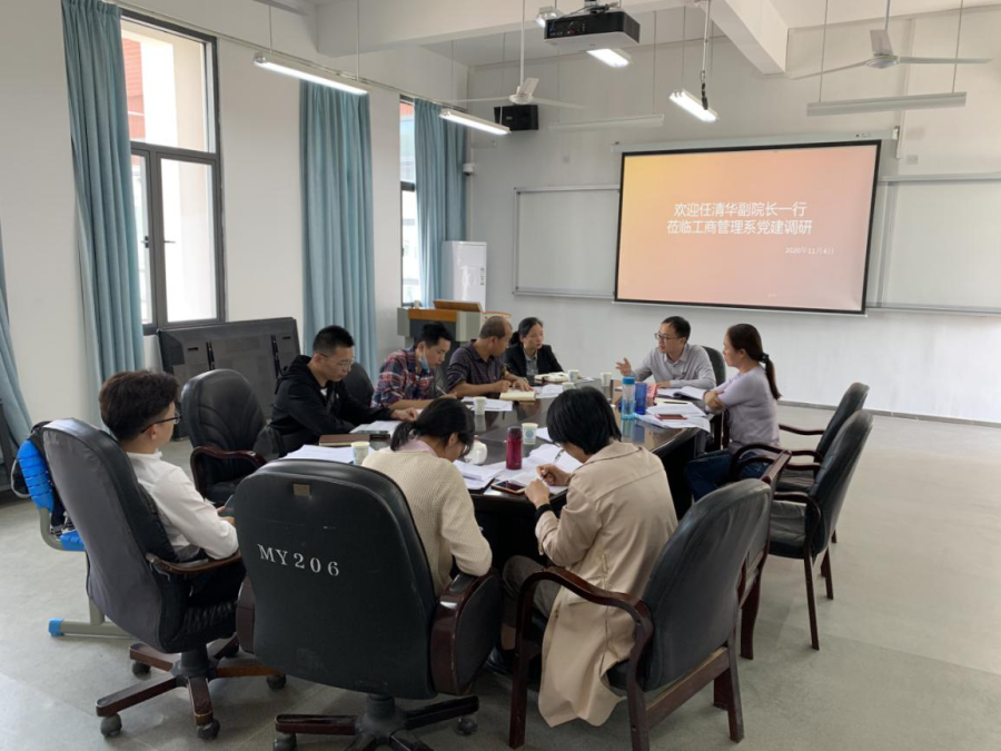 2020年11月4日,学院副院长任清华携创建办负责人陈志君赴工商管理系开展党建调研活动。系党总支书记、系部主任、各教研室主任、实训中心主任、组织员、教学秘书、行政秘书出席会议。
