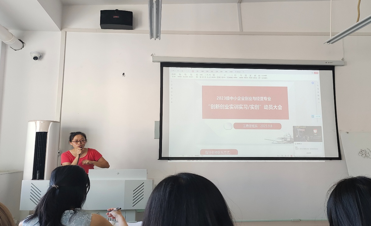2025年9月8日下午,工商管理系于工商楼北407教室隆重举行了2023级中小企业创业与经营专业“创新创业实训实习/实创”动员大会。工商系主任方丰霞、教务办主任郑宗旭、中小创专业主任林欣欣、市场营销专业主任朱晓宇、辅导员陈静等老师共同出席了本次动员会。