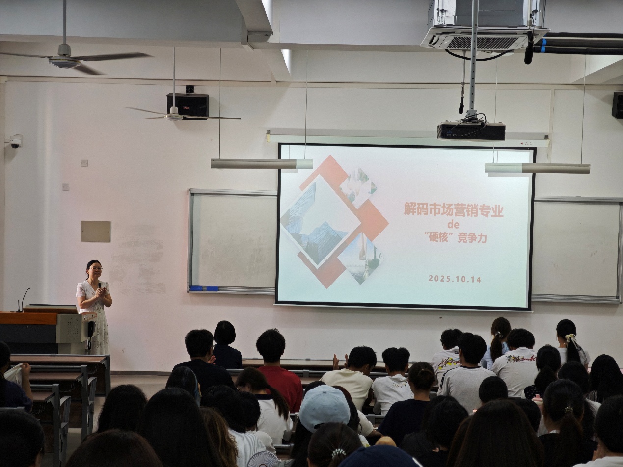 2025年10月14日,我系市场营销专业带头人黄智萌以《解码市场营销专业的硬核竞争力》为题,面向2025级市场营销专业新生开展了一场别开生面的“说专业”活动。本次活动旨在帮助新生深入理解专业内涵、明确学习目标、树立专业信心,为未来三年的学习与成长奠定坚实基础。