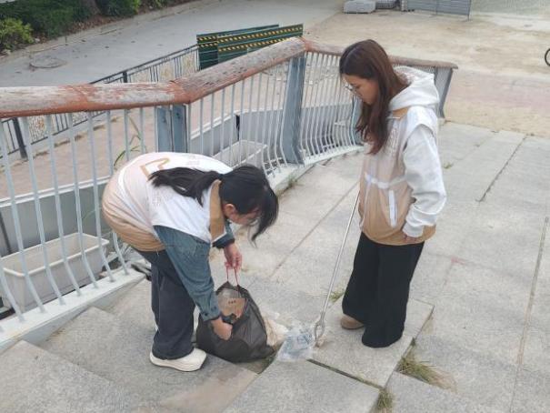 活动伊始,同学们携扫帚、畚斗、夹子及垃圾袋等工具,于天桥下迅速集合。负责人点名完毕后,众人分组行动,一场有序的清洁行动即刻展开。现场分工明确,协作默契:有的同学躬身俯身,用长夹精准夹取天桥缝隙里的烟头与塑料包装;有的同学挥动扫帚,将散落的落叶、尘土归拢成堆;还有同学手持垃圾袋,及时撑开袋口,把各类垃圾逐一收纳。在大家的通力协作下,天桥环境焕然一新,尽显整洁清爽。
