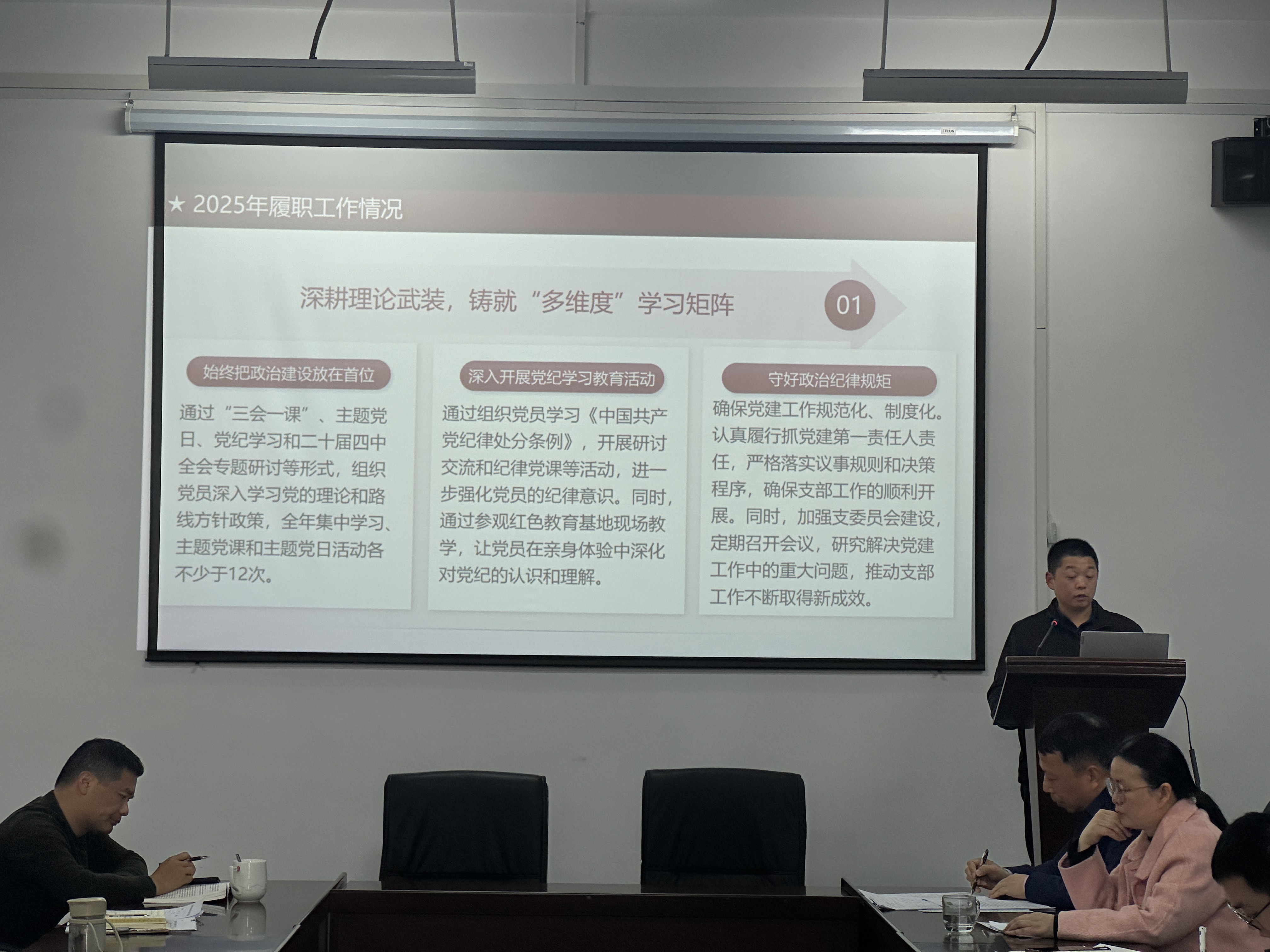 第一党支部书记黄智萌以《强化政治引领,聚焦融合发展,以高质量党建推动事业高质量发展》为题,系统汇报了支部工作。2025年,第一支部坚持以党的政治建设为统领,严格落实“第一议题”制度,全年组织理论学习研讨21次,深入开展“五学五课堂”等活动,筑牢思想根基。支部着力锻造坚强堡垒,规范执行“三会一课”等制度,全年开展主题党日及现场教学8次,党员发展管理严格有序。党建工作与中心工作融合成果显著,引领获批省级课程思政示范课2门;党员教师在技能竞赛、创新创业大赛中指导学生获省级奖项5项;支部“强国行”专项行动扎实推进,与10家单位党建共建,科技特派员工作、社会服务成效明显,“荔枝红”党建品牌影响力持续提升。