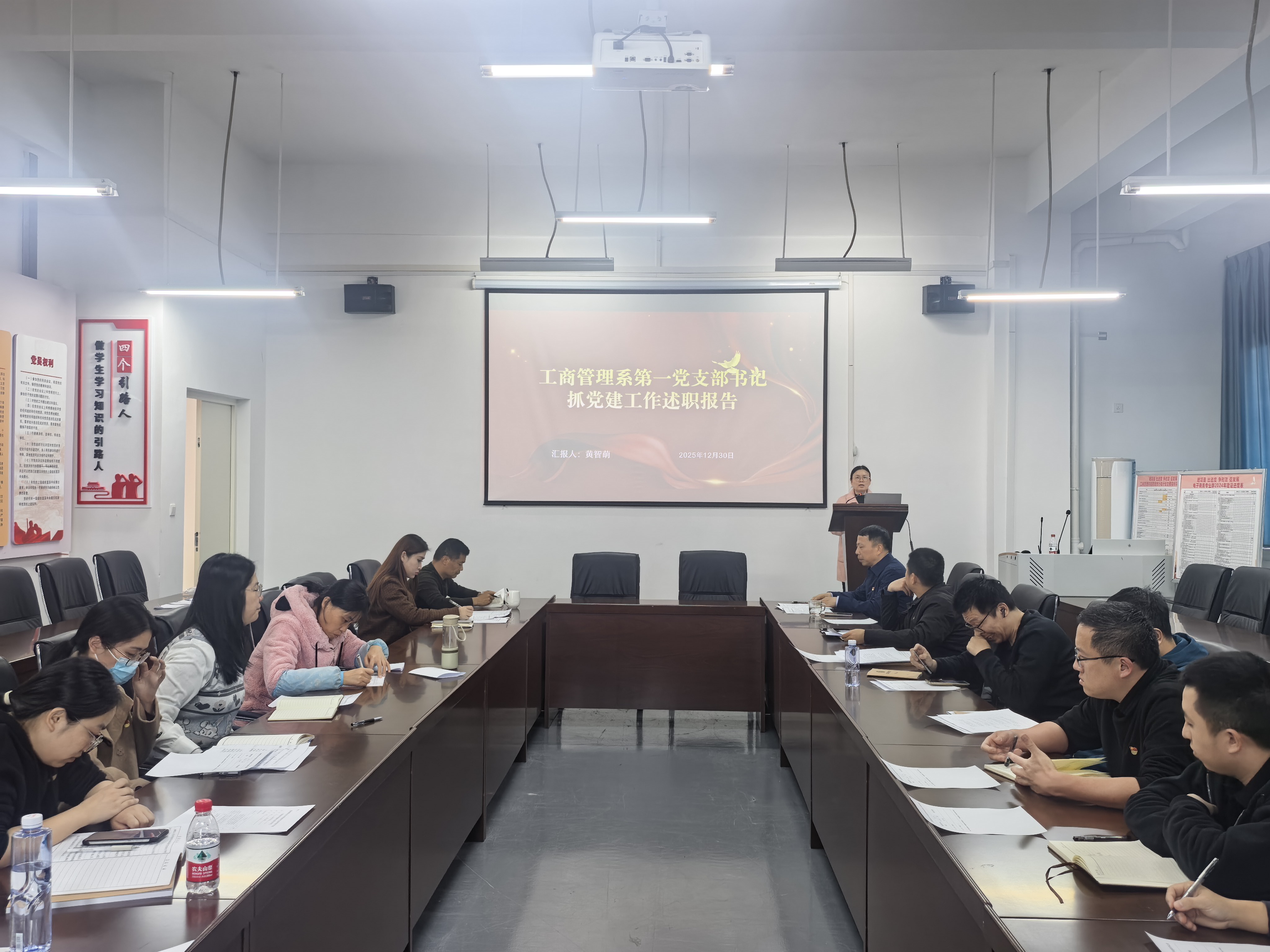 为全面检验基层党建工作成效,压实管党治党政治责任,12月30日,工商管理系党总支在工商楼南301会议室召开2025年度党支部书记抓党建工作述职评议会。系第一党支部书记黄智萌、第二党支部书记林楠冰先后进行现场述职,全面总结过去一年的工作,深刻剖析问题,明确未来方向。系党总支委员、师生党员代表参加会议并进行评议。