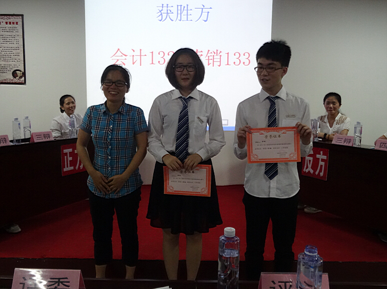 当晚,闯入本次辩论赛总决赛的两支辩队分别是会计132与营销133联队和会计143队。他们的决赛辩题为“大学生创业应该遵循已有的成功经验还是应该另辟蹊径独创经营模式”。因为双方参辩同学准备充分,再加上前几场比赛中积累了丰富的经验和辩论技巧,双方辩手在决赛中发挥出前所未有的水平。经过激烈的交锋,会计132与营销133联队发挥出色,赢得了观众和评委的一致好评,摘取了本次辩论赛总决赛的桂冠,一路过关斩将的会计143队屈居次位。本场的最佳辩手则被反方三辩邱清同学夺得。