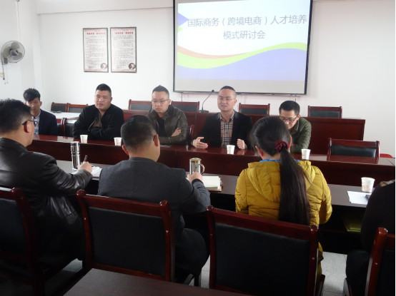3月14日下午, 在25号楼401室召开了国际商务人才培养模式研讨会。工商管理系主任蔡元忠、副主任方丰霞、副主任刘伟、四大专业教研室主任以及商务教研室老师与跨境电商企业6位高管参加了此次会议。