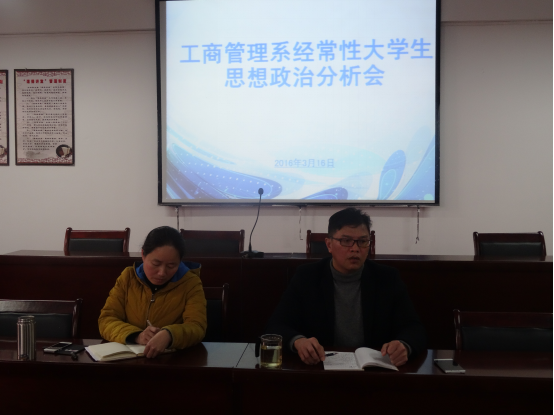 为了进一步的了解我系学生思想动态,3月16日下午三点在25号楼401室召开了大学生经常性思想政治分析会。参加此次会议的有工商管理系党总支书记陈凯、副主任方丰霞、分团委负责人陈丽晶、6位辅导员。