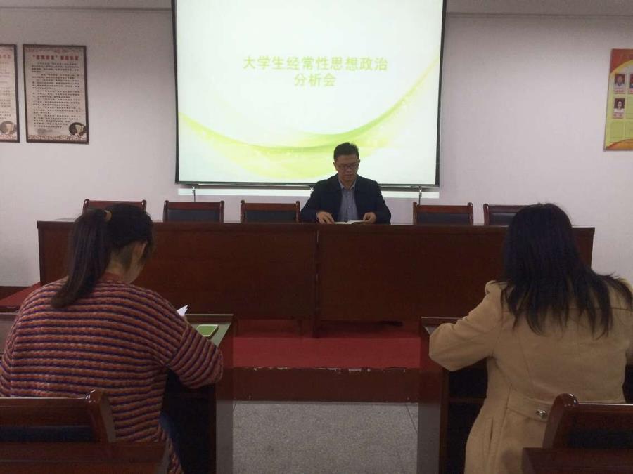 为了深入贯彻落实我系大学生经常性思想政治工作,进一步提高我系大学生的综合素质,我系于12月1日在25号楼401教室召开大学生经常性政治思想分析会。参加会议的有工商管理系党总支书记陈凯、副主任方丰霞以及各辅导员。