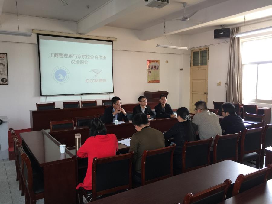 会上,双方就合作模式、学生实习就业环境、工资待遇、安全责任等具体问题进行了深入的交流和洽谈,达成多项共识。胡经理和戴经理介绍了京东与高校的合作经历,就与我校相关专业开展校企合作事宜提出了建议。副主任方丰霞强调增强学生的实践能力是工商管理系孜孜以求的目标,通过与京东集团的合作,可以将电子商方面的实战经验和实际操作模式引入校园,引导学生了解大型电商平台开展电子商务、物流管理等全流程化管理和操作,提高学生的综合素质。通过与京东集团合作建立实践基地,依托校园京东派的窗口让学生参与运营实践,提升自身的综合能力。