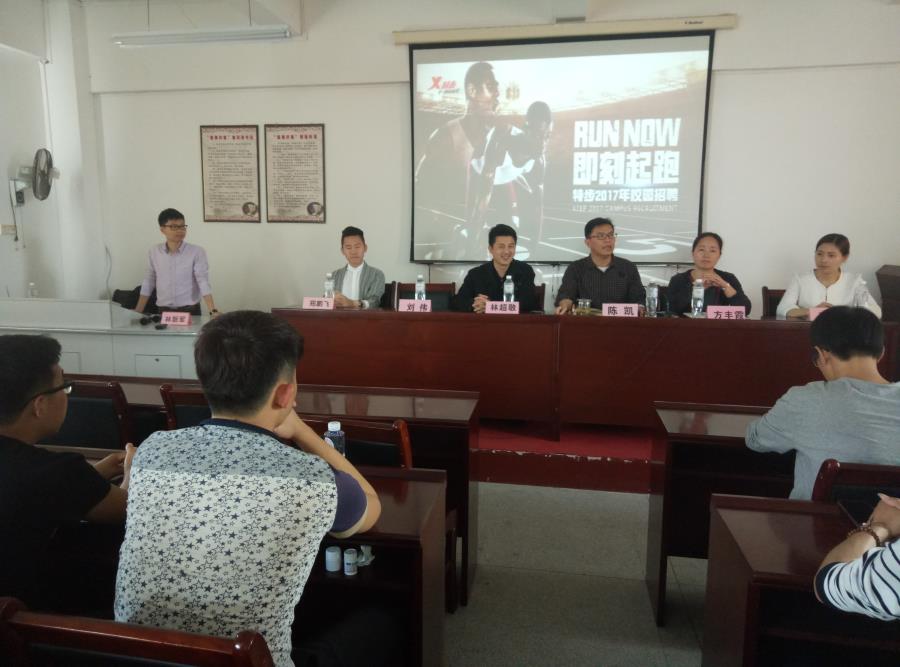 20174月7日,特步集团25号楼401教室召开了一次针对市场营销专业的宣讲会。此次出席会议的有系党总支书记陈凯、副主任方丰霞、营销教研室主任黄智萌等老师和特步集团福州分公司直营管理部高级经理林超敬、人力行政部经理阮珊珊、加盟区域经理郑鹏飞、人资主管林新军以及15级市场营销专业的同学。