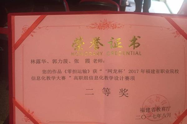 近日,由省教育厅主办、省电教馆承办的“网龙杯”2017年福建省职业院校信息化教学大赛圆满落下帷幕,经过紧张激烈的角逐,工商系林露华、张霞、郭力菠老师组成的参赛队伍以扎实的基本功和良好的现场发挥,取得二等奖的优异成绩。