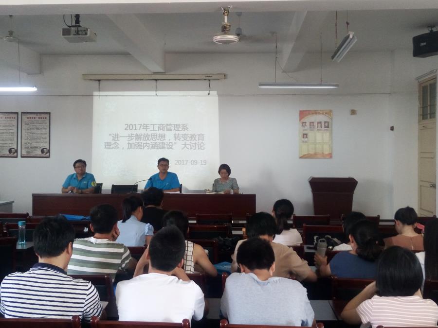 为深入贯彻落实党的十八大、十八届六中中全会和国务院关于加快发展现代职业教育的精神,紧紧围绕学院创建省级示范性高职院校目标,持续深入推进学院内涵建设。2017年9月19日下午2点40分,我系在25号楼401会议室开展以“进一步解放思想,转变教育理念,加强内涵建设”为主题的学习讨论活动。出席会议的有工商管理系全体教师。