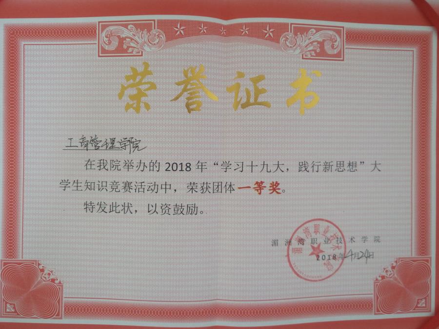 2018年“学习十九大,践行新思想”大学生知识竞赛团体一等奖。