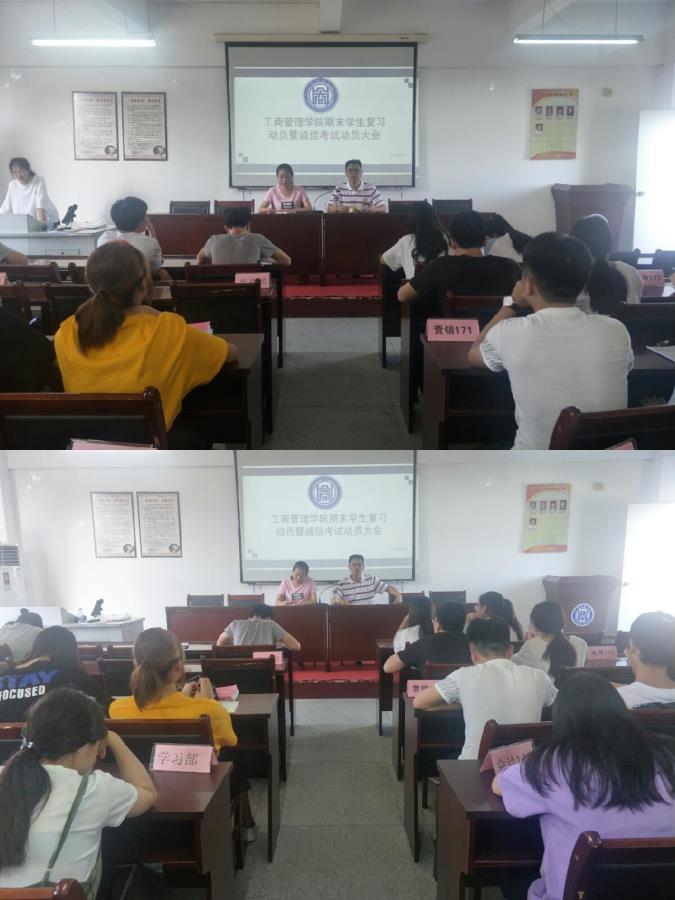 2018年6月25日下午4点30分在25号楼401举行了工商管理学院期末学生复习动员暨诚信考试动员大会。系党总支书记陈凯老师、分团委书记陈延红老师、各班级主要学生干部和部分学生代表参加了动员大会。