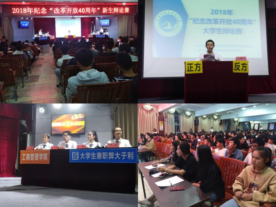 2018年10月30日下午5点于17号楼201室举行湄职院“纪念改革开放40周年”大学生辩论赛初赛。学院办公室李慧颖老师、任琳琳老师和基础部连超凡老师担任本场比赛评委。初赛第一场由工商管理学院对阵信息工程学院。双方辩手围绕“大学生兼职的利弊关系”展开激烈的辩论。