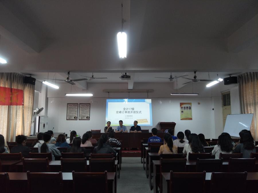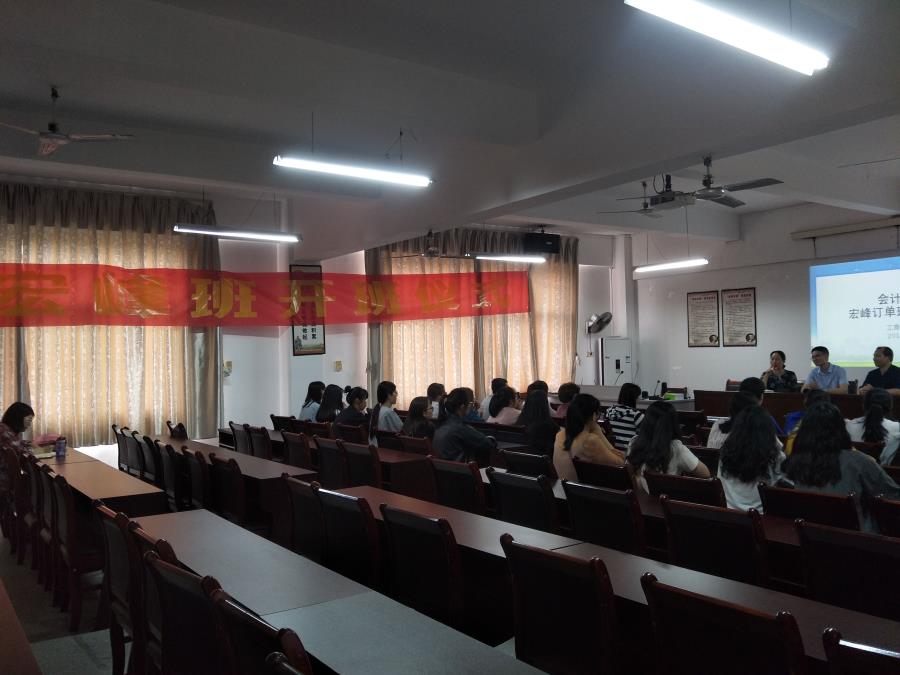 2019年5月5日下午,工商管理系在系主任方丰霞和系党总支书记林宗洪的带领下举办了“宏峰班开班仪式”,并且我系邀请了中交建宏峰集团有限公司副总裁蔡明洪先生为同学们开讲。