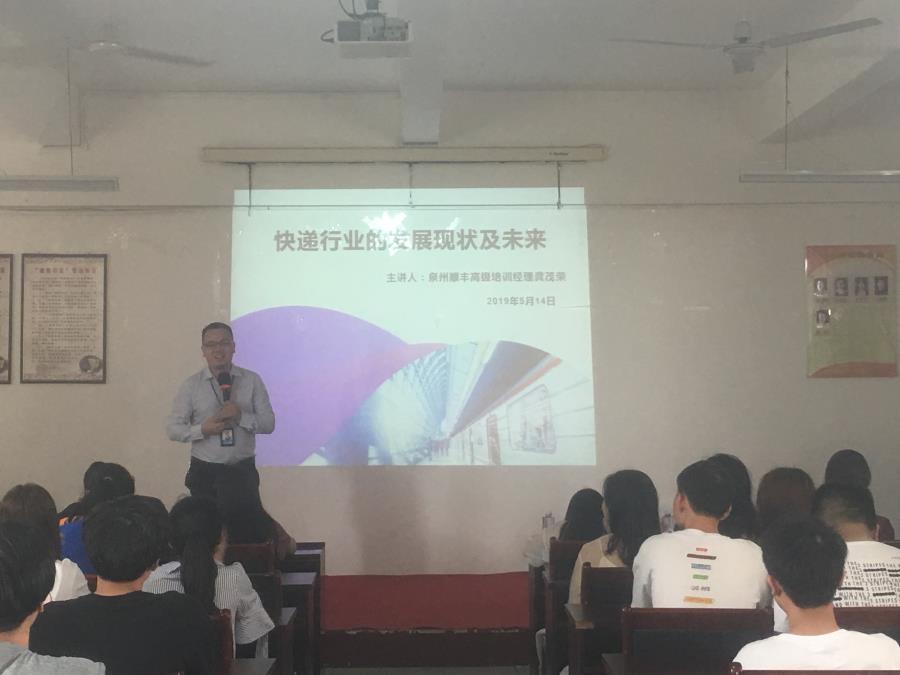 2019年5月14日下午两点三十分我系于25号楼401会议室召开快递行业的发展现状及未来讲座,主讲人为泉州顺丰高级培训经理龚茂荣。参加人员有物流管理教师林莉、行政秘书朱晓宇及物流171、181学生。