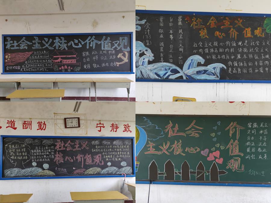 为不断深化社会主义核心价值观教育,积极引导广大青少年学生全面认识和正确理解“富强、民主、文明、和谐、自由、平等、公正、法治、爱国、敬业、诚信、友善”为基本内容的社会主义核心价值观,让社会主义核心价值观深入人心,永驻校园。我系于2019年6月18日开展以“社会主义价值观”为主题的黑板报评比活动。