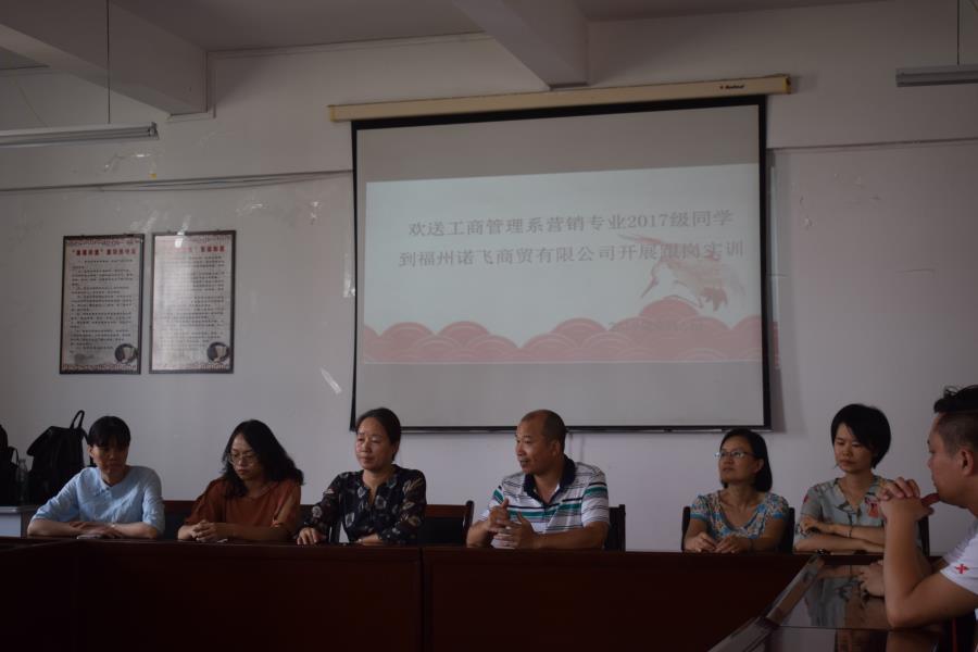 2019年9月6日上午,工商管理系在25号楼前欢送2017级市场营销专业的7位学生前往福州诺飞商贸有限公司进行为期三个月的跟岗实训。福州诺飞商贸有限公司是特步(中国)有限公司的福州分公司,与工商管理系长期开展校企合作。工商系党总支书记林宗洪、系主任方丰霞、市场营销专业教研室主任黄智萌等人参加了欢送会并与学生合影留念。