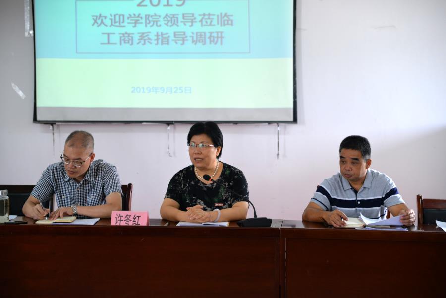 2019年9月25上午,许冬红院长携教务处处长李智仁、产学研处长蔡雪敏、创建办陈志君一行赴工商管理系调研。系部主任、系党总支书记、系副主任,各教研室主任、实训中心主任、分团委书记、组织员、教学秘书、行政秘书出席会议。