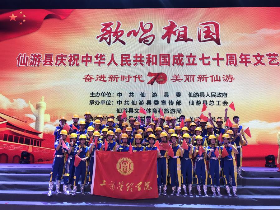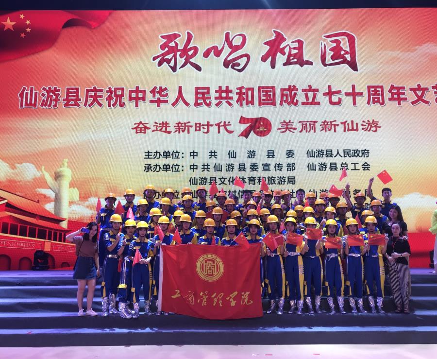 在2019年9月29日晚上7点30分这个特殊的日子里,由工商管理系五十五名学生组成的工人代表队伍参加仙游县“庆祝中华人民共和国成立七十周年”文艺演出。 他们的节目有大合唱、朗诵、歌舞、小品等。演出的节目形式多样,内容丰富,立意深远,深切表现出了参赛者对祖国和家乡的热爱。表演者们的热情感染着现场的每一位观众,现场观众挥舞着手中的国旗,热情高涨,掌声此起彼伏。其中工商系学子们表演《时代号子》节目给观众们留下了深刻的印象,此次表演在全体演员与观众的《歌唱祖国》大合唱中取得了圆满落幕。 正所谓少年强则国强。此次活动对于当代大学生加强爱国主义教育、弘扬社会主义核心价值观、丰富校园文化生活具有重要的意义,鼓舞着当代大学生拼搏进取,开创未来。