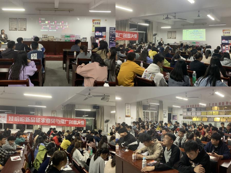 2019年11月19日晚上7点,我系在25号楼401室举行娃哈哈新品征求意见与推广创意大赛宣讲会。参与本次宣讲会的有营销教研主任黄智萌、营销专业老师谢小兰、娃哈哈集团工作人员以及18级、19级市场营销专业的学生。