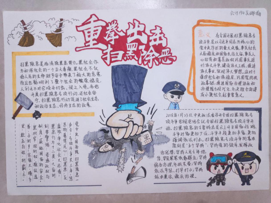 最后为更好的宣传扫黑除恶知识,开展了扫黑除恶手抄报的征集,通过征集扫黑除恶手抄报并在微信公众号上进行展出,让同学们加强对扫黑除恶知识的理解,带动整个校园参与扫黑除恶行动中来。