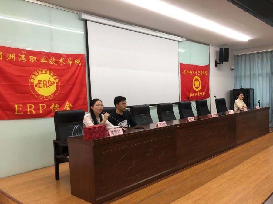 会议首先由ERP协会指导老师陈丽琴老师发表演讲,回顾了两个协会获得的良好成绩,并对新一届成员做出了美好展望;随后沙盘协会指导老师王立声讲话,提出新任协会成员需发扬吃苦耐劳精神;最后由郑宗旭老师总结致词,希望19级成员再接再厉,20级成员更上一层楼。随后两大协会的上任会长发表了2019年协会年度总结,现任会长发表了就职演说。会议最后,会议主持人宣读了各部长名单,并由老师们为他们颁发聘书。