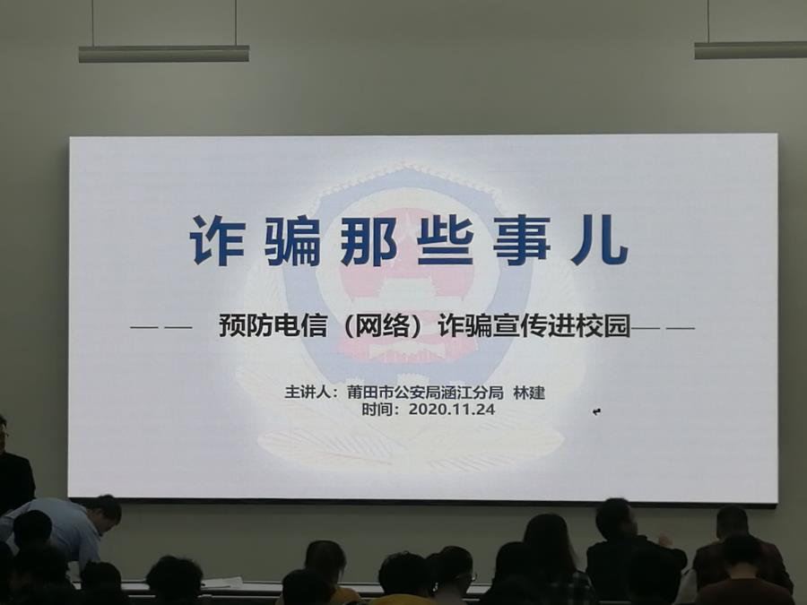 为提升学生防范意识、切实增强2020级学生电信网络防诈骗辨识能力,11月24日下午3点,学校邀请莆田市公安涵江分局的警官林迪在信息楼中102进行了反诈骗知识教育讲座,参加本次讲座的有公安局的警官们、学工处处长陈凯、各系教室安全员、各班的班长和团支书。