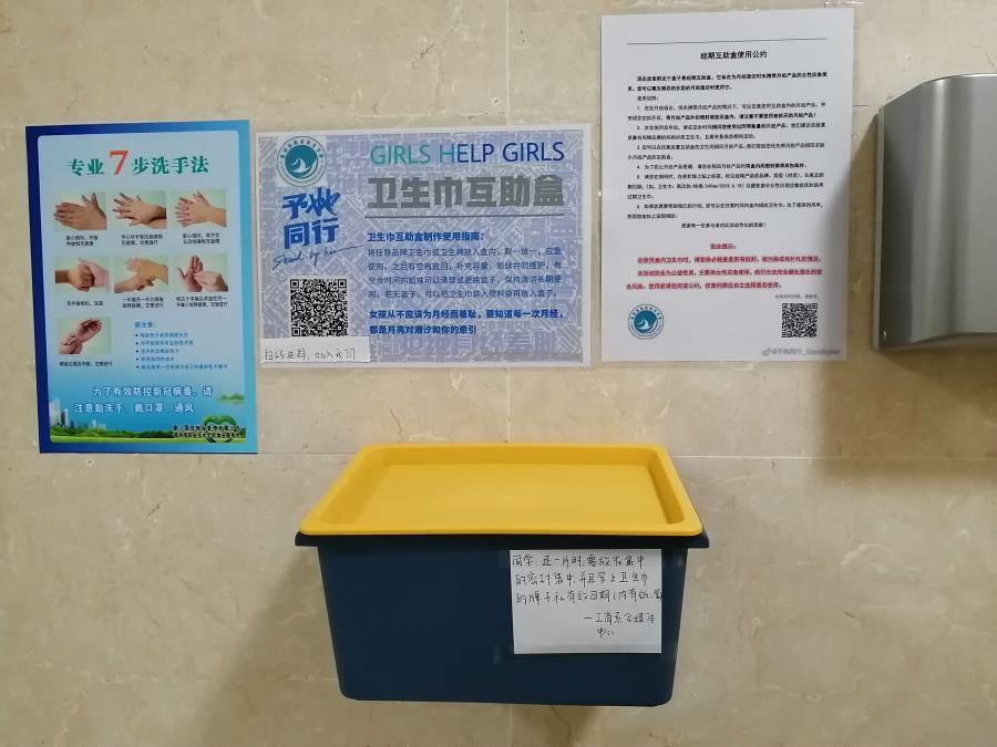 在校内举行卫生巾互助盒公益活动是由华东政法、中国政法学生首发,随即多所高校学生自发参与,就是在为校内月经造访时未携带月经产品的女性应急使用,提供便利此活动旨在为国内面临月经贫困的贫困地区或贫困未成年女性送去卫生巾,月经知识和性教育。为帮助女性度过有尊严的经期,使女性在特殊时期也能做自我,我系在公教楼女厕安置互助盒,受到许多学生的良好的反响,该活动采取取一放一的方式,仅供应急使用,使互助盒容量得到保证,在一定程度上方便了同学们的生活,让这场善意的传递、爱的留存和维护得到支持。