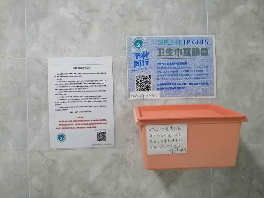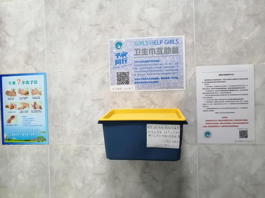 在校内举行卫生巾互助盒公益活动是由华东政法、中国政法学生首发,随即多所高校学生自发参与,就是在为校内月经造访时未携带月经产品的女性应急使用,提供便利此活动旨在为国内面临月经贫困的贫困地区或贫困未成年女性送去卫生巾,月经知识和性教育。为帮助女性度过有尊严的经期,使女性在特殊时期也能做自我,我系在公教楼女厕安置互助盒,受到许多学生的良好的反响,该活动采取取一放一的方式,仅供应急使用,使互助盒容量得到保证,在一定程度上方便了同学们的生活,让这场善意的传递、爱的留存和维护得到支持。