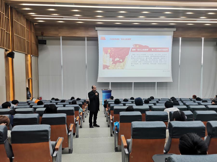 会议上,林宗洪书记引用了习近平主席近日对制止餐饮浪费行为一事所提出的如强化监管、采取有效措施、建立长效机制等方法、从各方面入手坚决制止餐饮浪费行为的重要指示,向同学们表明,“舌尖上的浪费”是一种不可取的、应该严厉制止的行为。同时,林宗洪书记利用学术报告厅中的大屏幕投放了PPT,将我国的粮食现状通过数据与文字相结合的方式呈现在了同学们面前,提醒同学们遏制餐饮浪费刻不容缓,让同学们对此有了一个直观且全面的认知。林宗洪书记告诉同学们,虽然我国的粮食生产连年丰收,但由于庞大的人口总数影响,仍然处在一个粮食紧平衡的状态,经不起挥霍。书记还指出,“多点菜有面子、浪费可以扩大消费、暴饮暴食是光盘”这三种思想是错误的,并以此要求同学们做到坚决杜绝餐饮浪费行为的同时,也要做到吃得饱、吃得好,拒绝吃得铺张、吃得浪费,要在心中树立厉行节约、反对浪费的观念。最后从餐饮需求、粮食安全、生态文明三个角度阐述了节约粮食的重要性。