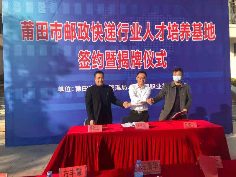 2020年12月30日下午3点30分,莆田市邮政管理局局长江德文、湄洲湾职业技术学院副院长任清华、工商管理系主任方丰霞、工商管理系党总支书记林宗洪、市快递行业协会会长、市顺丰速运公司赵刚总经理,以及各主要品牌快递企业负责人于湄职院物流快递点,举行莆田市邮政快递行业人才培养基地签约暨揭牌仪式。