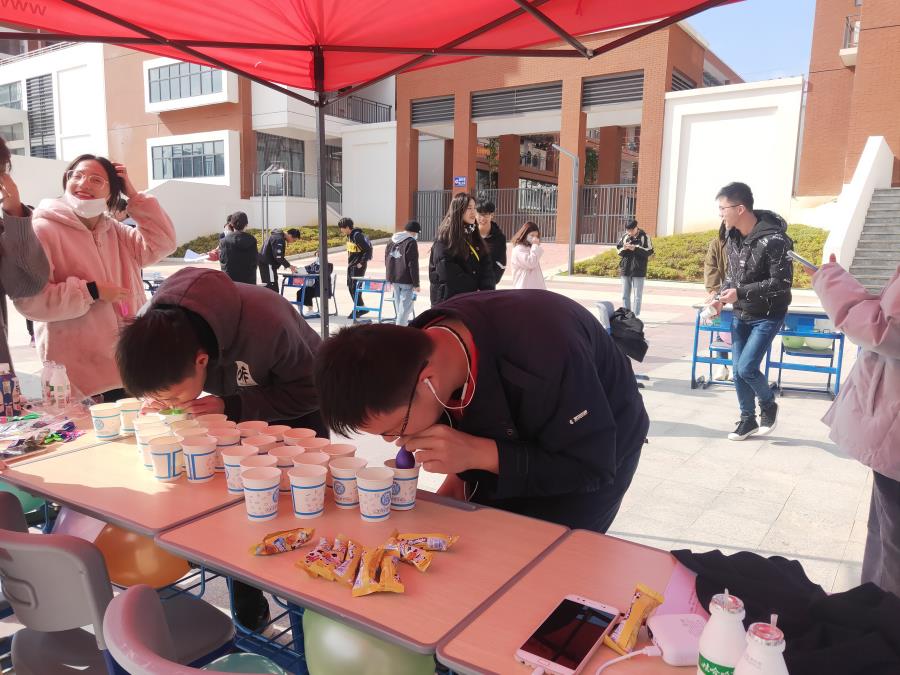 此次活动共有5个项目,分别是:心有灵犀猜成语、袋鼠赛跑、气球传杯子、神龙取水、步步为营。首先由文体部成员为大家示范游戏玩法,在感受到活动的趣味后,围观的同学们跃跃欲试,纷纷加入到比赛中。最后由每个项目的负责人登记好获奖同学的名单,统一颁发小奖品。