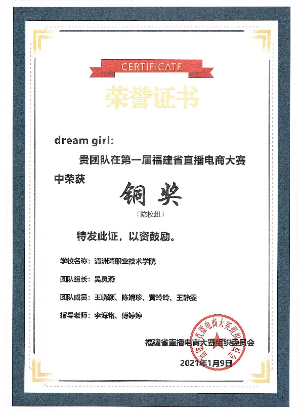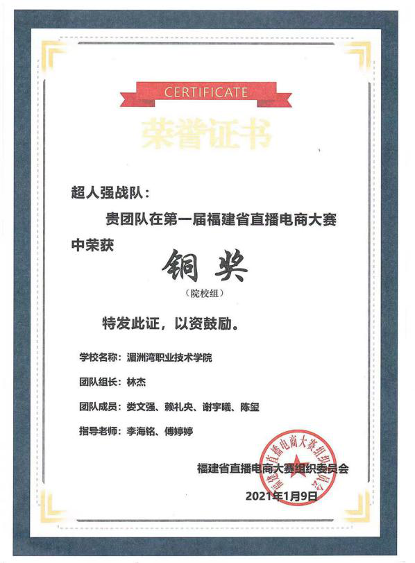 喜报!工商系电商专业同学参加第一届福建省直播电商大赛,取得省赛铜奖!此次大赛分为初赛和决赛两个部分。初赛由知识竞赛和拍摄短视频两个部分。