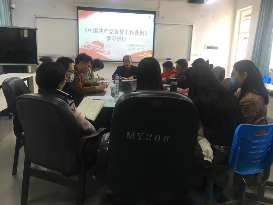 2021年1月27日,工商系党总支在公教二南301组织学习《中国共产党宣传工作条例》,全体教师党员参加学习。党总支书记林宗洪、第一支部书记黄智萌和组织员黄慧芳作为党员代表在会上做交流发言。