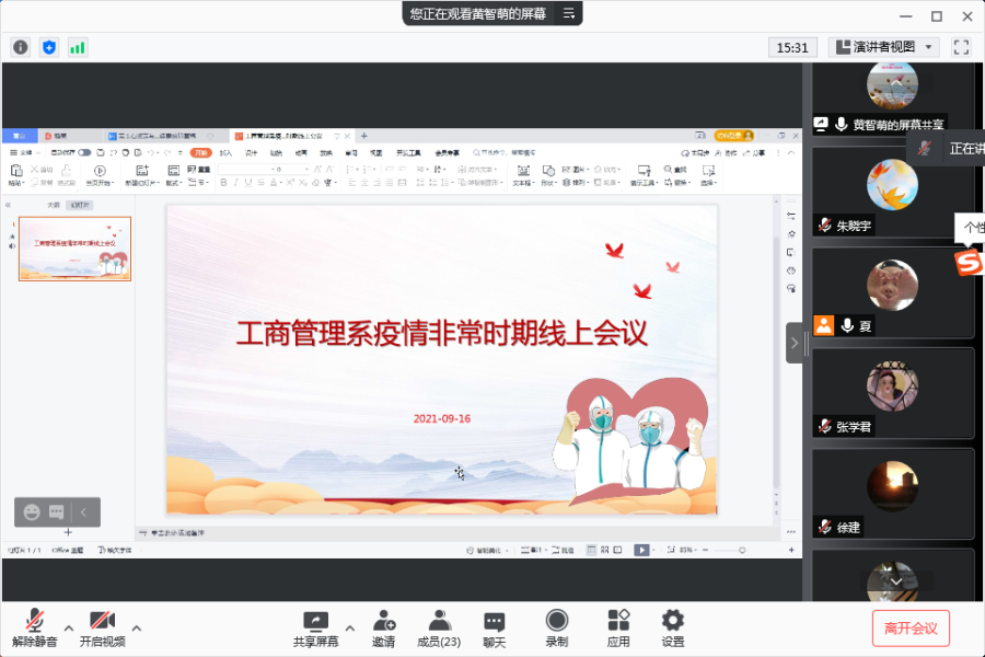 2021年916日中午12点,工商系于腾讯会议召开疫情非常时期线上会议,出席会议的有工商系党总支副书记许志敏、系主任方丰霞、系副主任徐建、黄智萌以及各教研室主任、实训中心主任、组织员、辅导员、教学秘书、行政秘书、学生会干部。