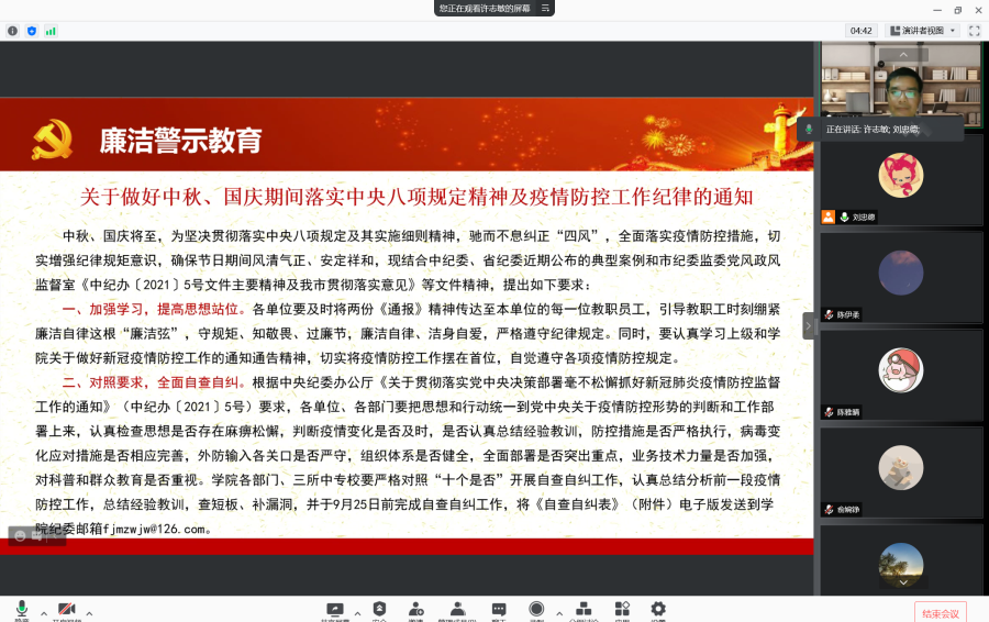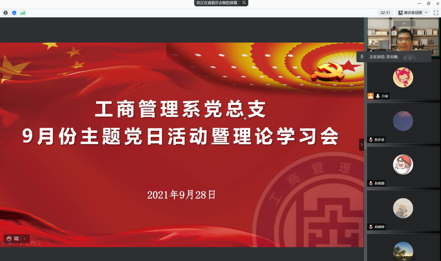 为扎实推进党史学习教育,大力宣传党的光辉历程、伟大成就和优良传统,9月28日工商管理系党总支召开线上9月份主题党日活动暨理论学习会。总支全体党员参加本次会议,会议由工商管理系党总支副书记许志敏主持。