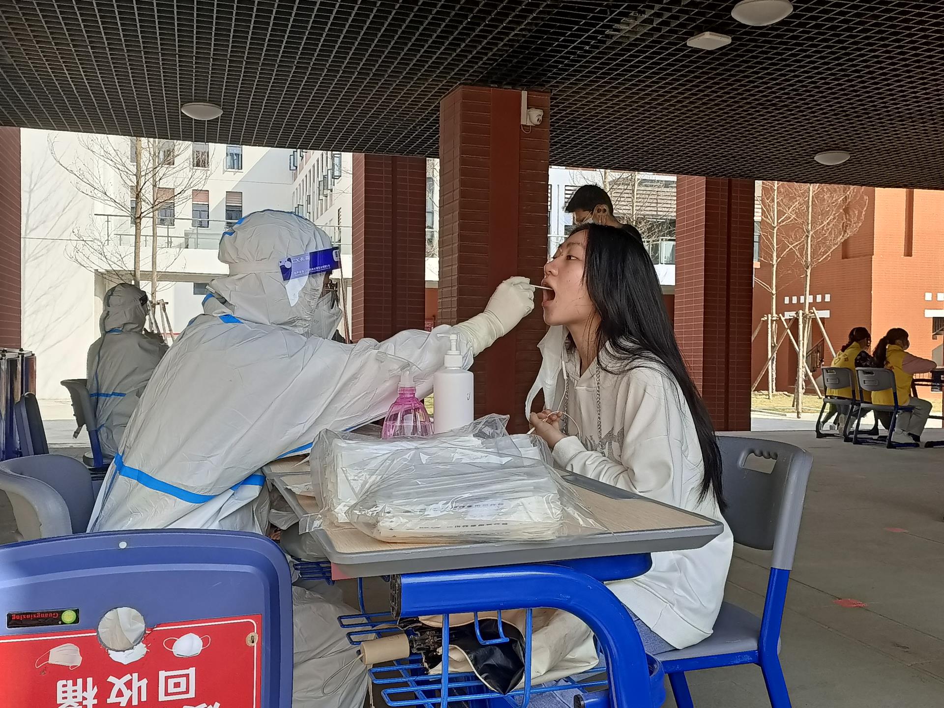 检测现场,全体师生佩戴好口罩。参检的同学们间隔一米有序排列,按照指定检测路线,依次步入等候区等候。参检队伍每十人为一组,志愿者们在对学生进行身份验证后,医护人员开始检测采样,采样结束后,全体参检人员在指定地点进行手部消毒,而后快速撤离采样区。本次核酸检测工作在老师和志愿者们的引导下顺利完成,整个检测过程秩序井然,我系学生积极配合,医护人员爱岗敬业。