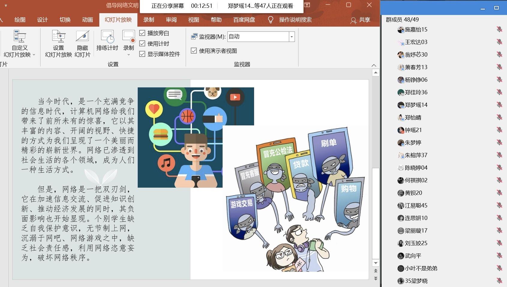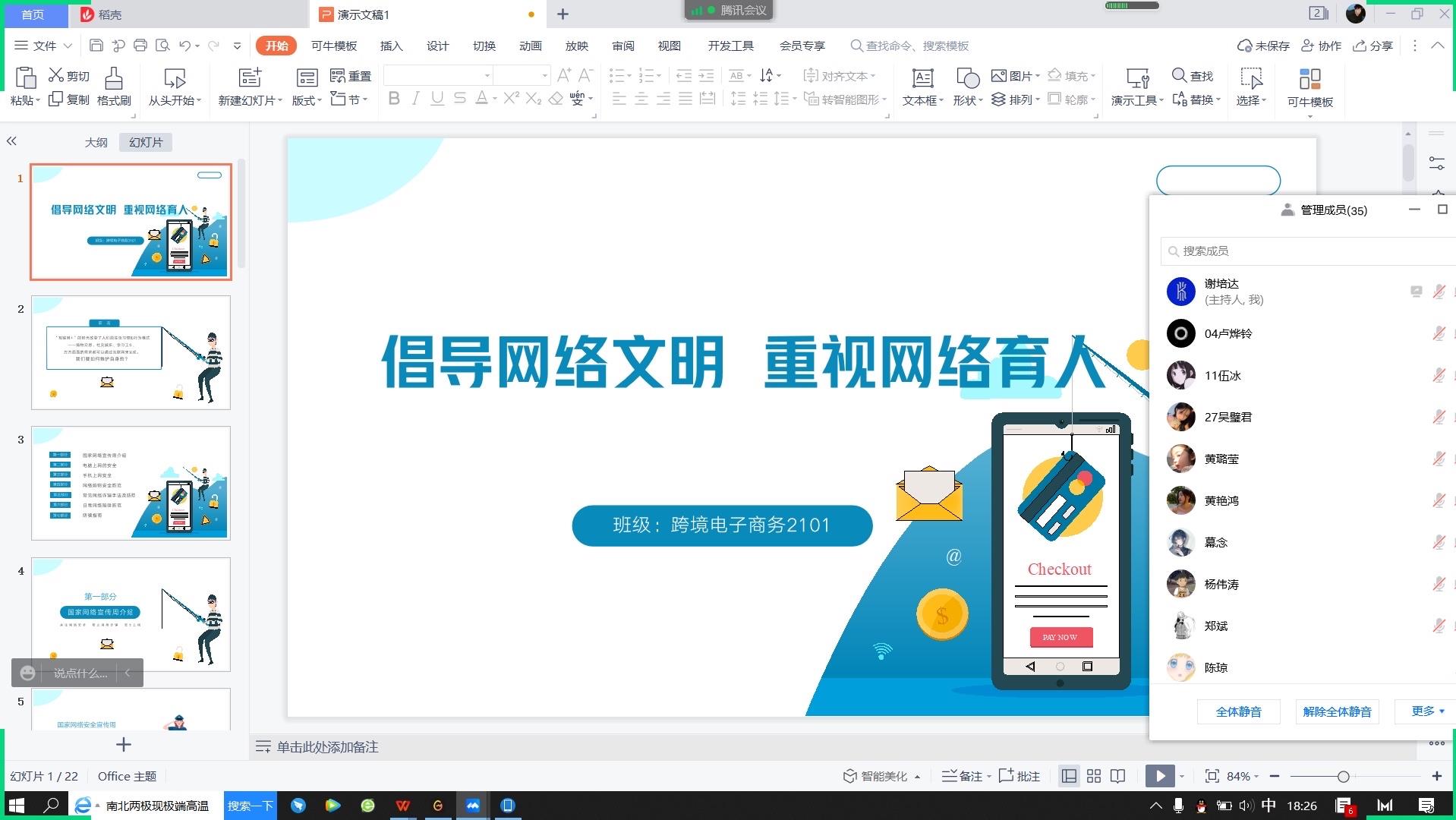 为进一步预防同学们沉迷网络,培育文明上网的良好习惯,营造安全、健康、文明、和谐的校园氛围。2022321日下午,湄职院工商管理系20级以及21级于线上开展“倡导网络文明 重视网络育人主题班会,本次主题班会由各班团支书主持。