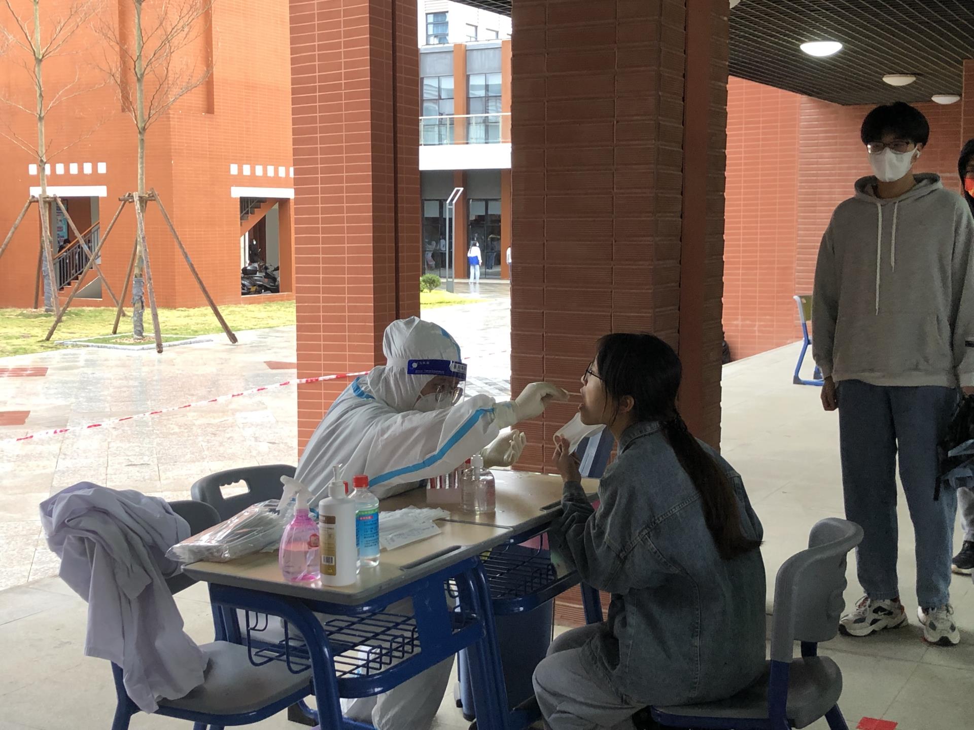 上午800整,待检人员分批次到指定的等候区候检。本次核酸每10人为一组,依次排队接受采样。检测现场严格落实疫情防控要求,全体人员全程佩戴口罩间隔1米,分时段、分批次,陆续进入等候区和采样区。上午830,检测工作正式开始。检测前,入党积极分子以及党员志愿者一起认真核对学生采样码,确保信息准确无误后由医护人员逐个为学生采集咽拭子。采样结束后,在志愿者引导下完成消毒手掌工作后迅速离开现场。虽然此次全面核酸检测人数较多,但在各方配合下,整个过程有条不紊、忙而有序,在预定时间内高效率、高质量完成全员采集任务。
