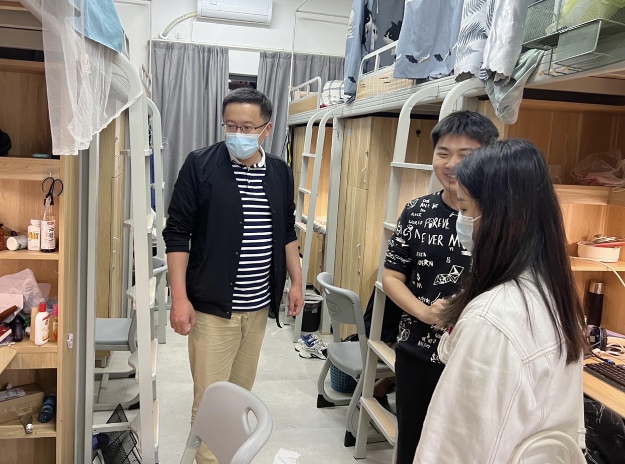 查寝过程中主要针对宿舍安全、卫生、用电等方面进行了重点检查,检查结果大部分学生的宿舍都较为整洁,也未出现大功率或超功率电器,重点关注了正在进行隔离的宿舍。许书记对多个安全卫生状况优秀的宿舍进行了表扬,对极个别卫生状况较差的宿舍提出了整改意见。同时他还叮嘱同学们要适应线上授课,提高学习效率,鼓励学生在疫情防控允许的条件下加强体育锻炼。最后,许书记带领辅导员们在竹苑工作站开展疫情防控常态化检查会议,对此次疫情防控工作进行总结,他表示要充分发挥各平台资源,加强对同学们的防范意识,宣传一些好的经验做法,保障同学们的生命安全和身体健康。