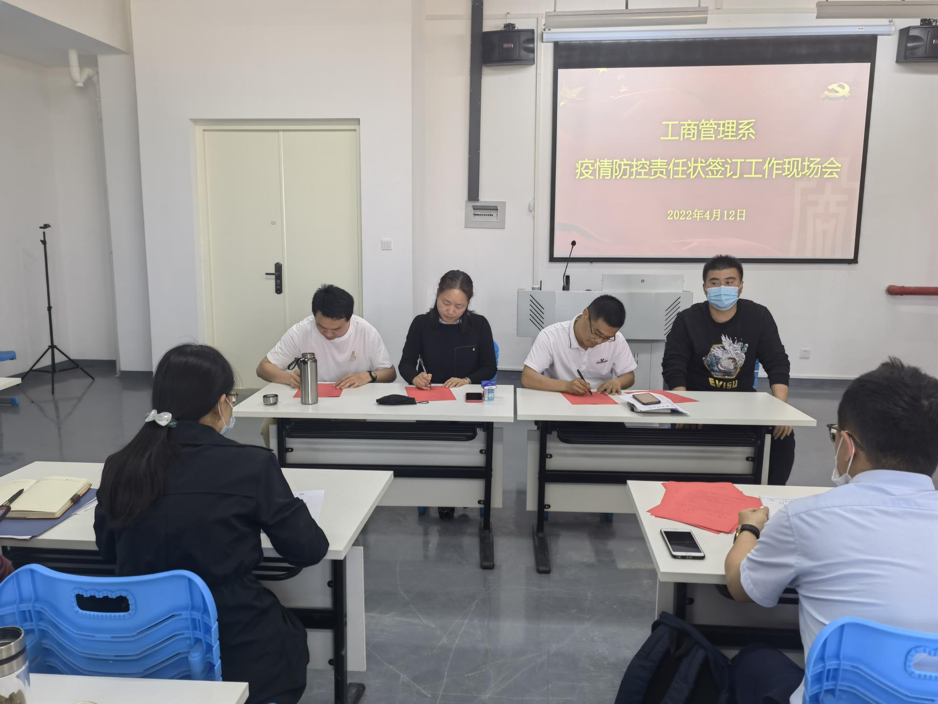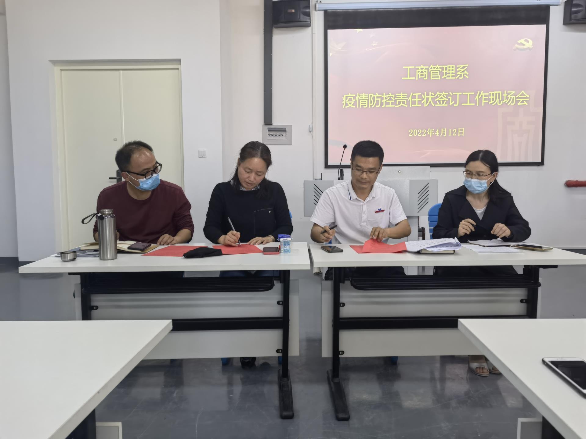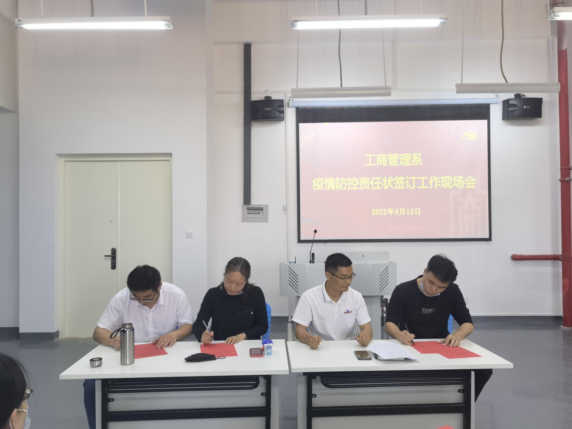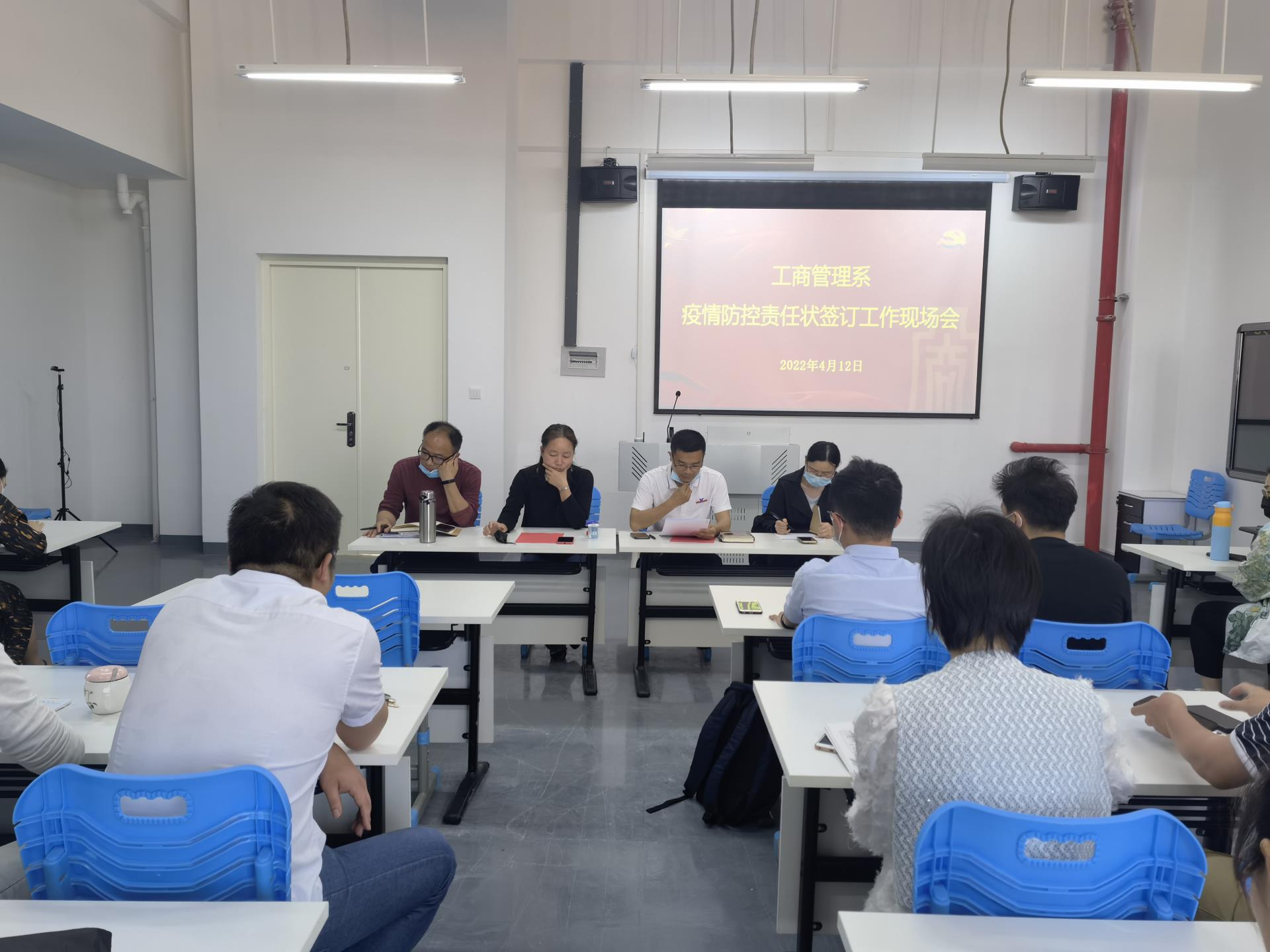 工商系于2022年4月12日下午2点30分召开疫情防控责任状签订工作,会议由工商系党总支副书记许志敏主持,工商系全系教师出席。