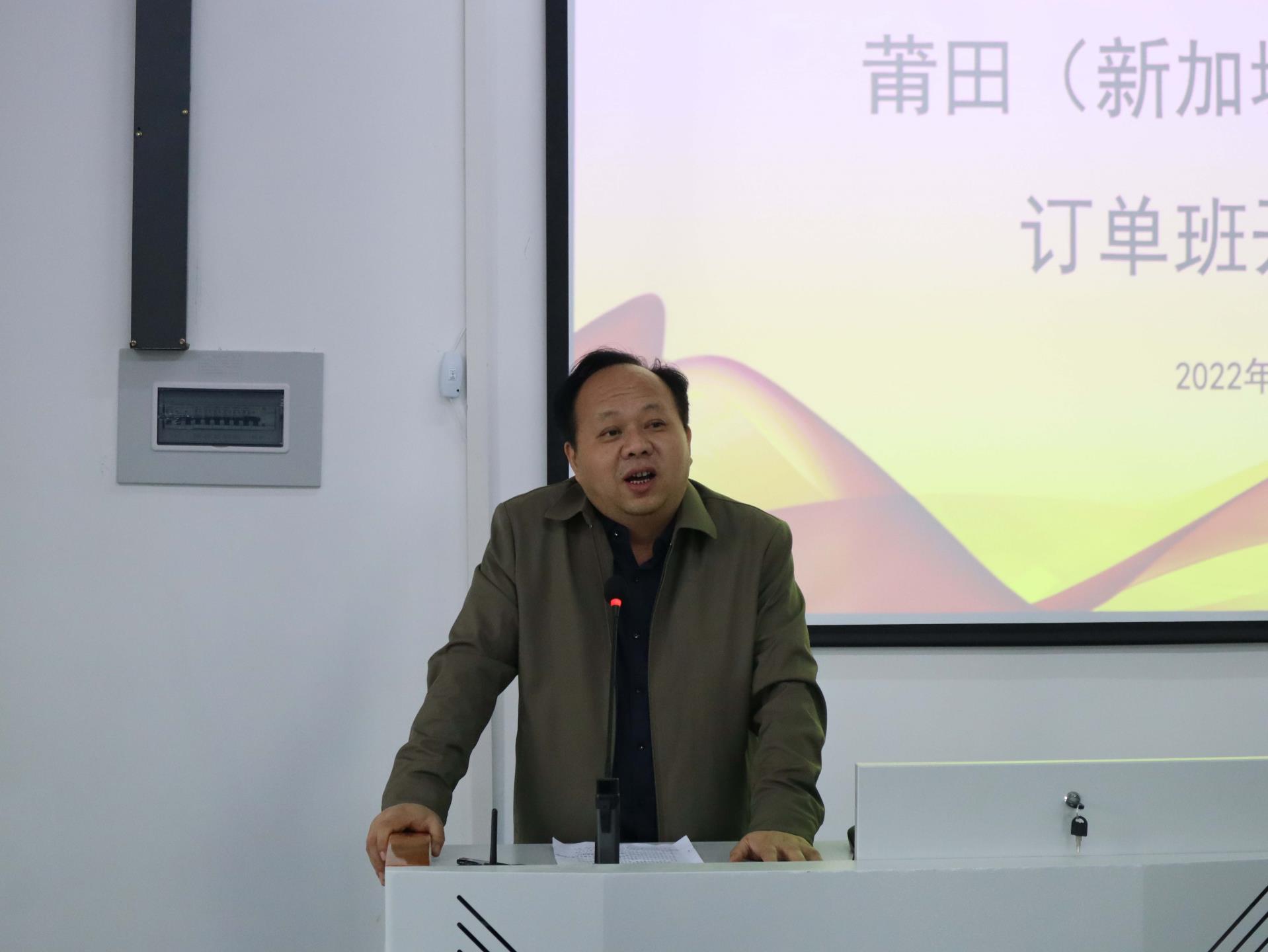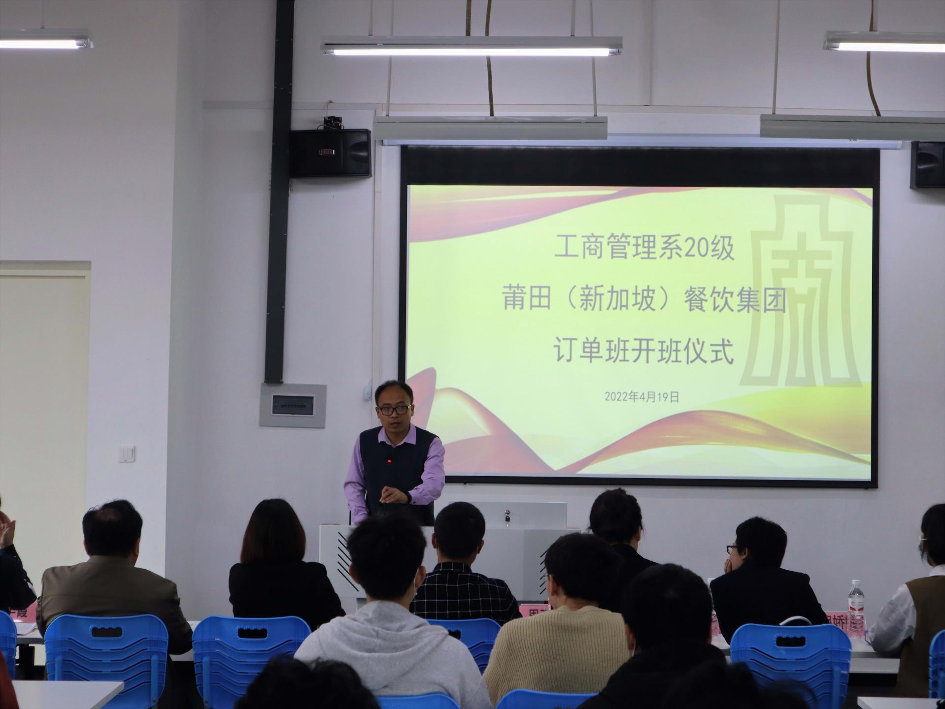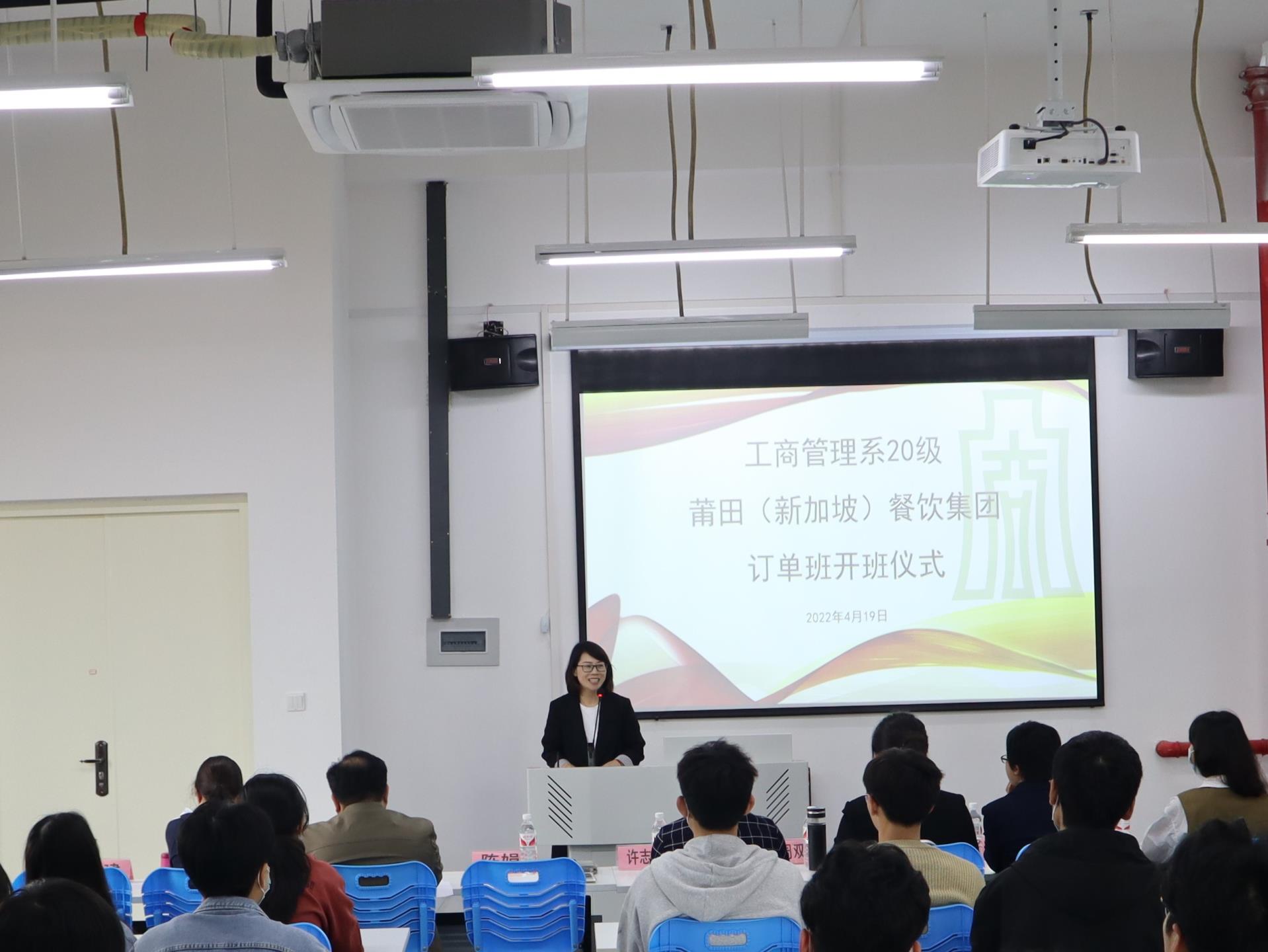 2022年4月19日下午两点,我系在工商楼306召开工商管理系20级莆田(新加坡)餐饮集团订单班开班仪式。参与此次开班仪式的有学院产学研处处长林志谦、工商管理系主任方丰霞、工商管理系党总支副书记许志敏、工商管理系副主任徐建、黄智萌等校方代表、莆田(新加坡)餐饮集团经理陈娟等企业方代表与我系20级订单班全体学生。