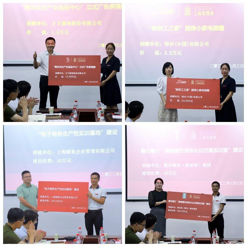 随后,是才子服饰股份有限公司、特步(中国)有限公司、上海赋氧管理有限公司、莆田餐厅对我系的捐赠仪式及全体参会人员合影留念。