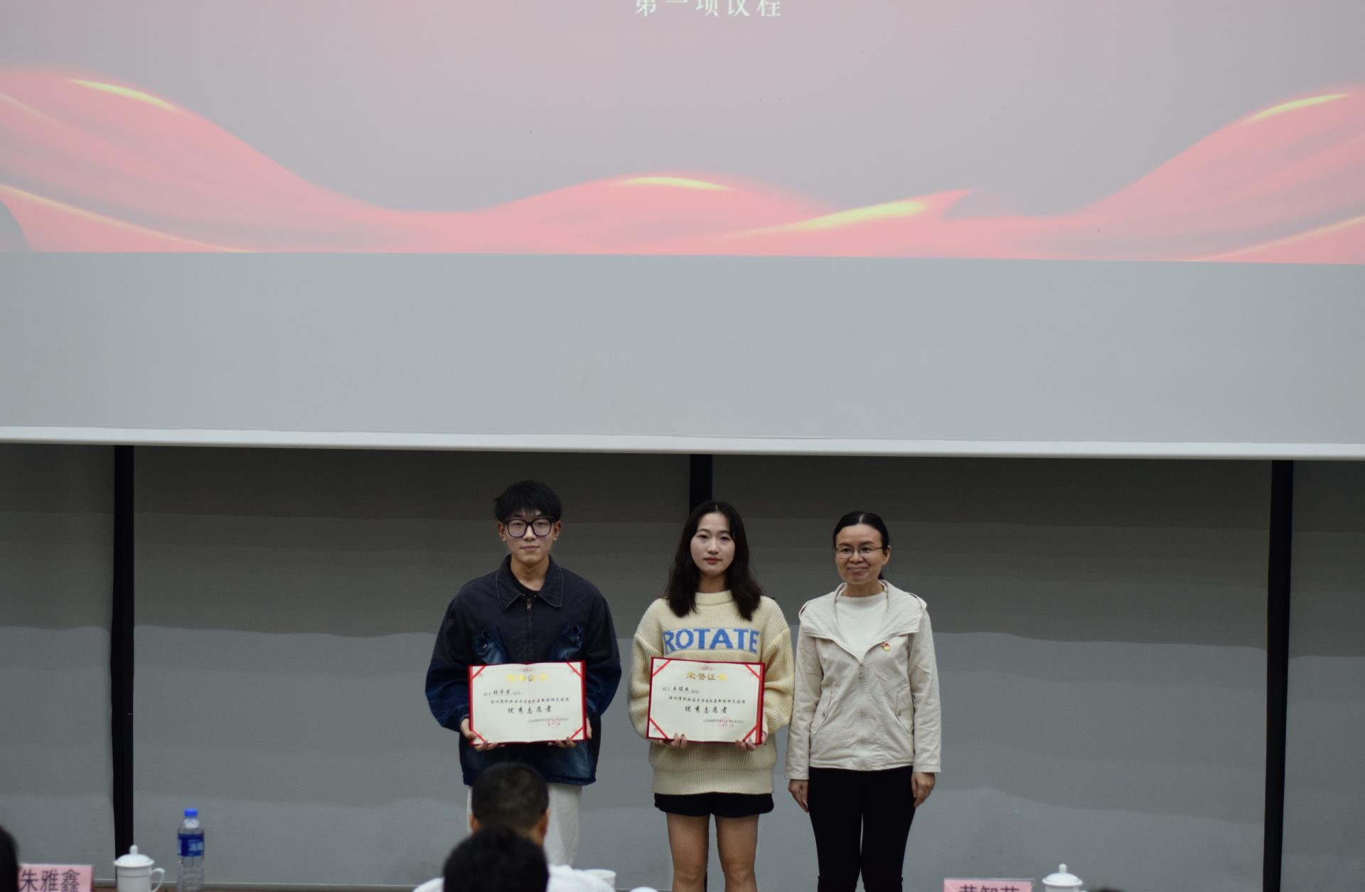 表彰大会伊始,由许志敏为校园疫情防控积极贡献者颁奖。接着由优秀志愿者张学君、王新坤发表讲话,两位同学从社区志愿服务经历出发,分享了在校期间当防疫志愿者、垃圾分类志愿者等经历,他们用心感受温暖瞬间,用行动践行青春力量,看似平凡却不平凡的志愿服务经历激励了很多同学们,现场掌声一片。