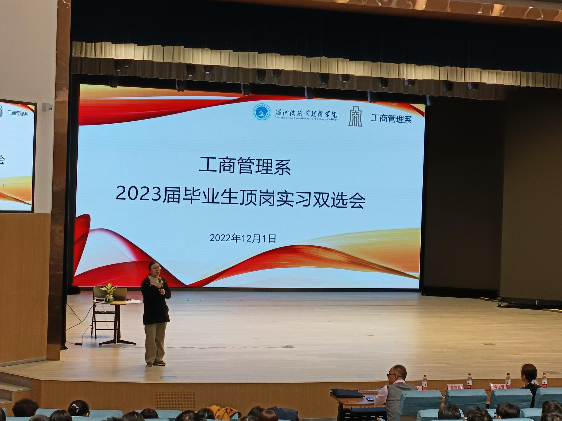 为了充分做好学校毕业生就业服务工作,给我系学子搭建实习锻炼的平台,加强学校与用人单位之间的沟通和交流。我系于2022年12月1日下午在立言大礼堂召开工商管理系2023届毕业生顶岗实习双选会。参与此次双选会的有工商管理系系主任方丰霞、系副主任徐建、黄智萌和青春之家公司总监李剑青等人以及2023届毕业生。