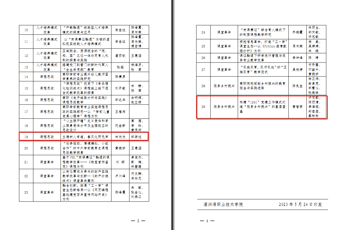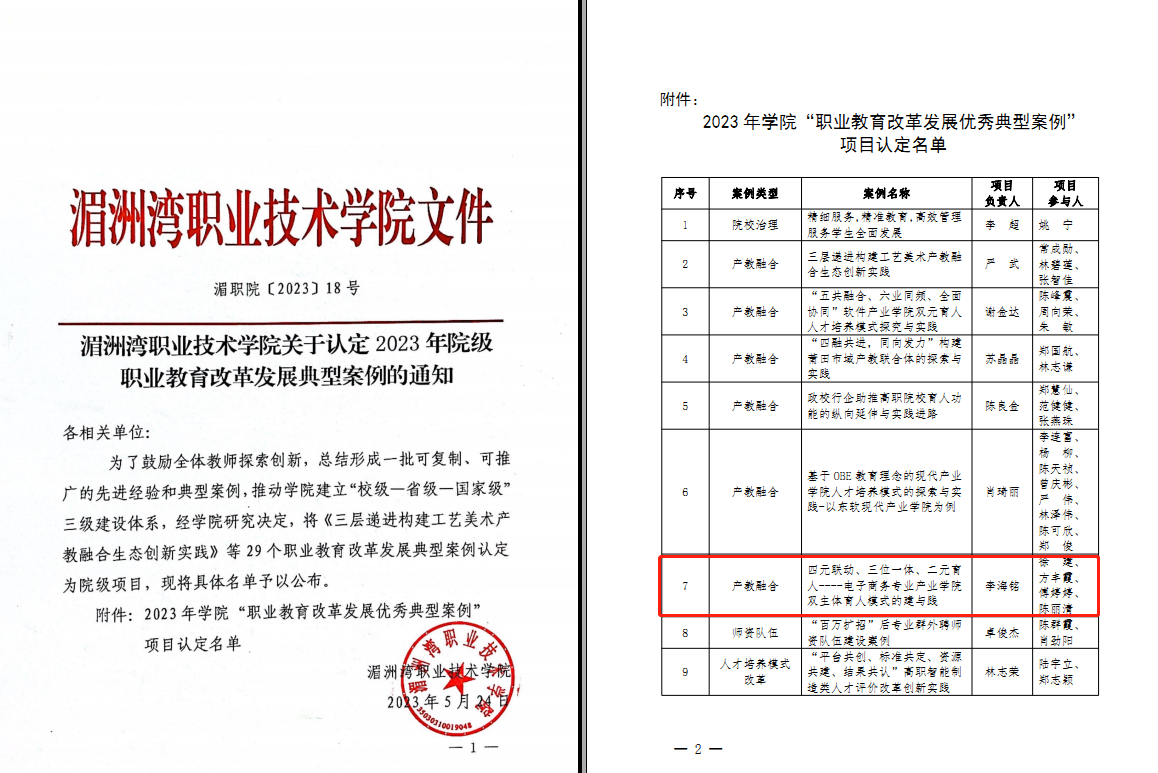 近日,为了鼓励全体教师探索创新,总结形成一批可复制、可推广的先进典型经验,推动学院建立“校级—省级—国家级”三级建设体系, 经学院研究决定,将《三层递进构建工艺美术产教融合新生态创新实践》等29个职业教育发展典型案例认定为院级项目,我系《四元联动、三位一体、二元育人——电子商务产业学院双主体育人模式的建与践》、《立德树人有道,春风化雨无声》、《构建“12341”党建工作模式,打造“服务乡村振兴”基层堡垒》等三个项目入选。