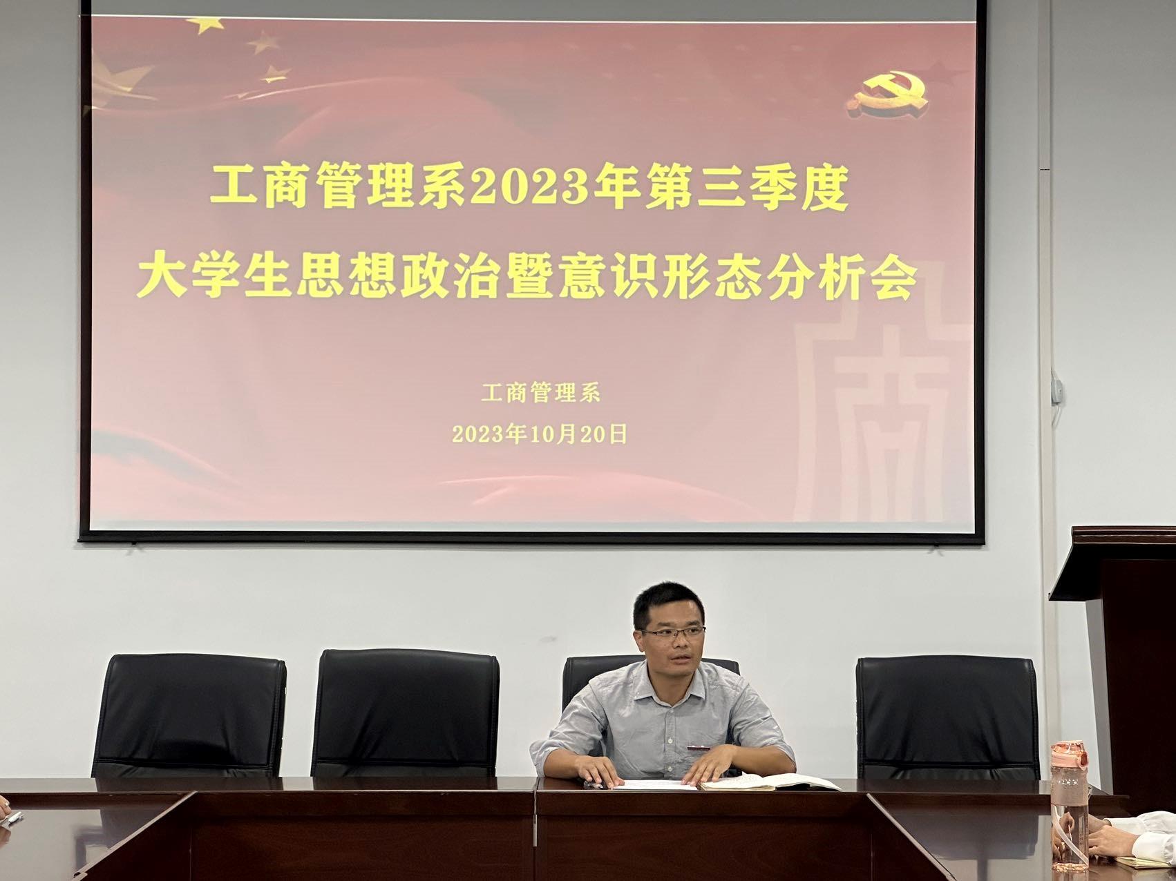 2023年10月20日,我系于工商楼南301召开第三季度学生思想政治暨意识形态分析会。工商管理系党总支副书记许志敏、系部辅导员以及学生代表参加了本次会议,会议分为四个议程,会议由许志敏主持。