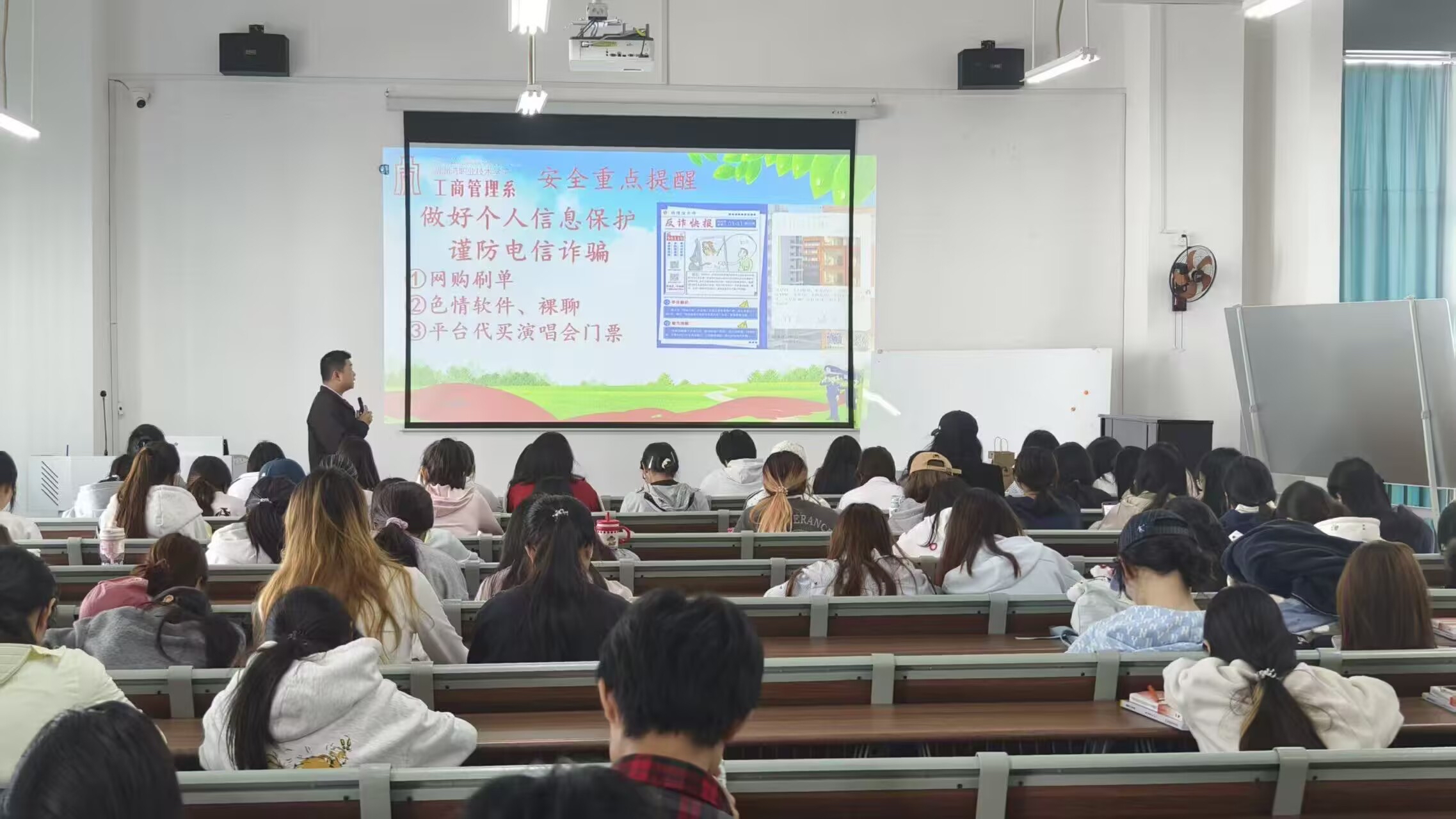 班会围绕主题设置“精神传承”与“安全宣讲”两个核心环节。在精神传承环节,师生通过讲述革命先烈、民族英雄的英勇事迹与红色故事,带领学生回顾先辈们为国奉献、舍生取义的崇高精神,引导大家深刻感悟初心使命。在安全宣讲环节,各班重点围绕清明节传统文化内涵、文明祭扫新风尚,以及假期防火安全、出行安全、人身安全、网络安全等内容开展科普教育,帮助学生树立文明祭扫、绿色祭扫的理念,进一步强化安全防范意识。